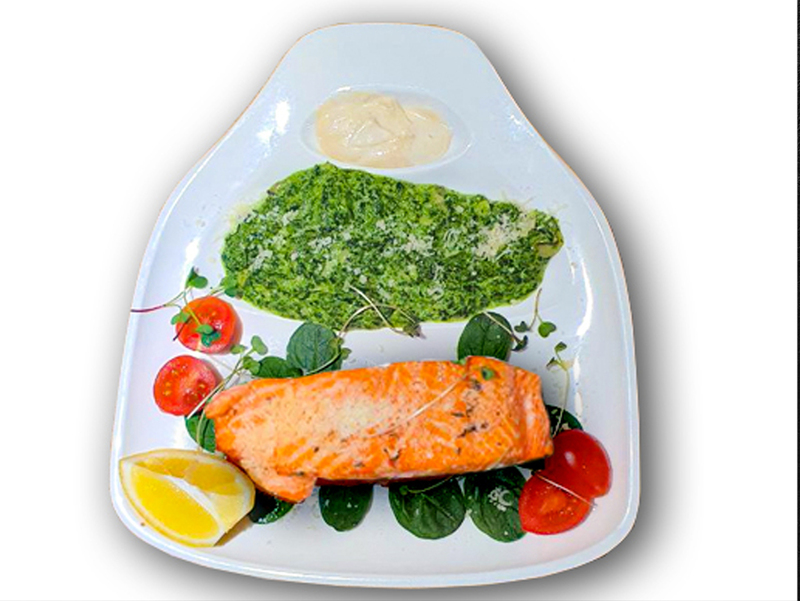 Стейк з лосося на шпинатній подушці з білими грибами